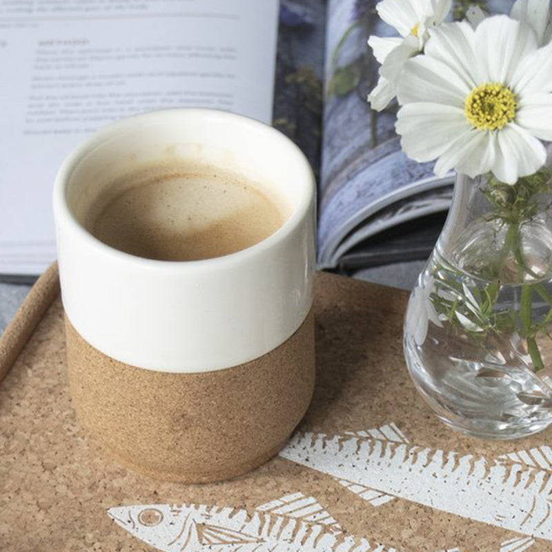 Contemporary ceramic coffee beaker with cork base. Not only will it bring the breezy Cornish style of Liga into your home, it's infinitely practical too. No handles? No bother. The cork base will stop your fingers getting burnt and it'll keep your cuppa warm for that little bit longer too. What's more, you can put the cup down on any surface without worrying about scratches or marks. Cork is a fantastic eco material as it's harvested approximately every 9 years without harming the tree.